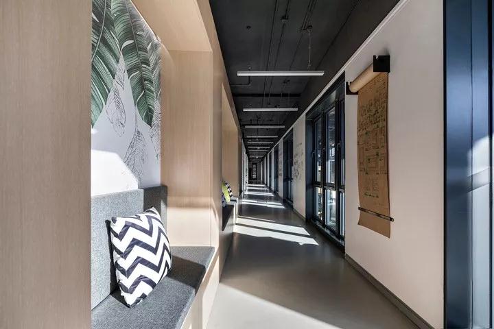 至于盒子以外的空间,设计师想凝聚更多的人文艺术气息,选择较多地去铺陈展示各种抽象的艺术线条和画作,同时为了不失去生活气息,各个角落选择颜色比较跳跃的家居什物,让它作为一个流动的户外广场,让人可以自在穿行其中,偶尔停驻观察,经得住人声鼎沸的喧扰,亦能提供心灵静憩的安宁。在这里,大家认真办公、生活、尽情交流、分享,它就是一个安放绿意,有极高包容度的公共空间。